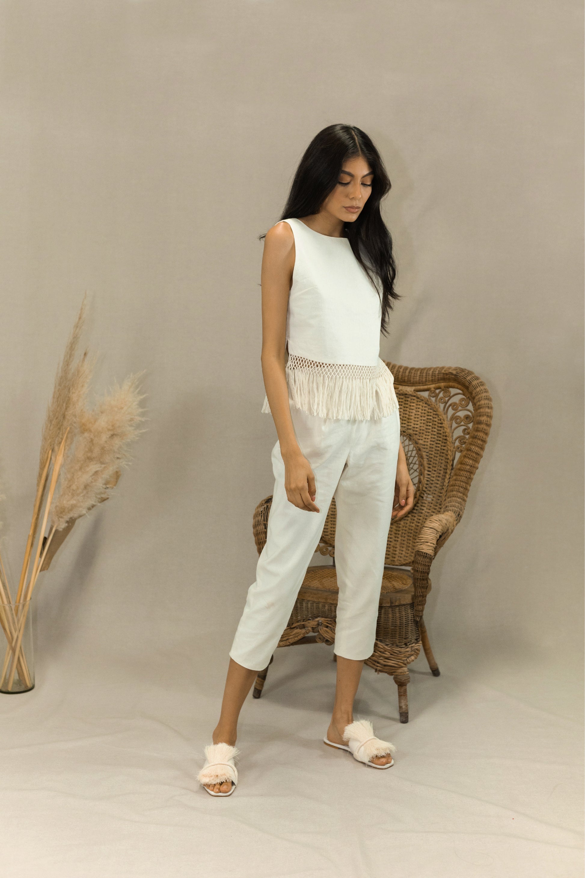 Blusa hecha de lino sin mangas de cuello ovalado con pinzas de busto, una pequeña abertura en los costados y un anudado de hilo de algodón inspirado en el rapacejo de los rebozos mexicanos hecho artesanalmente en nuestro taller.