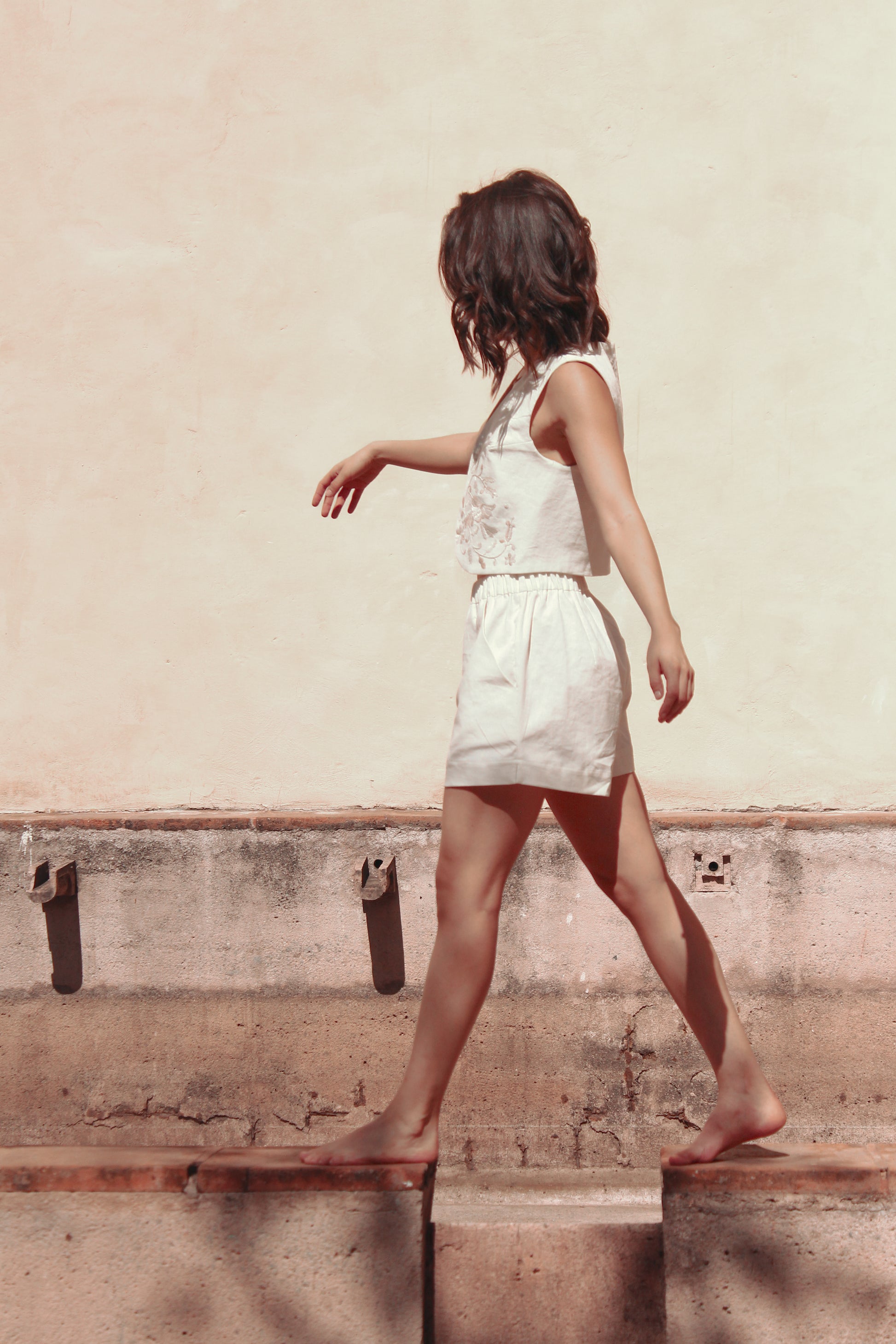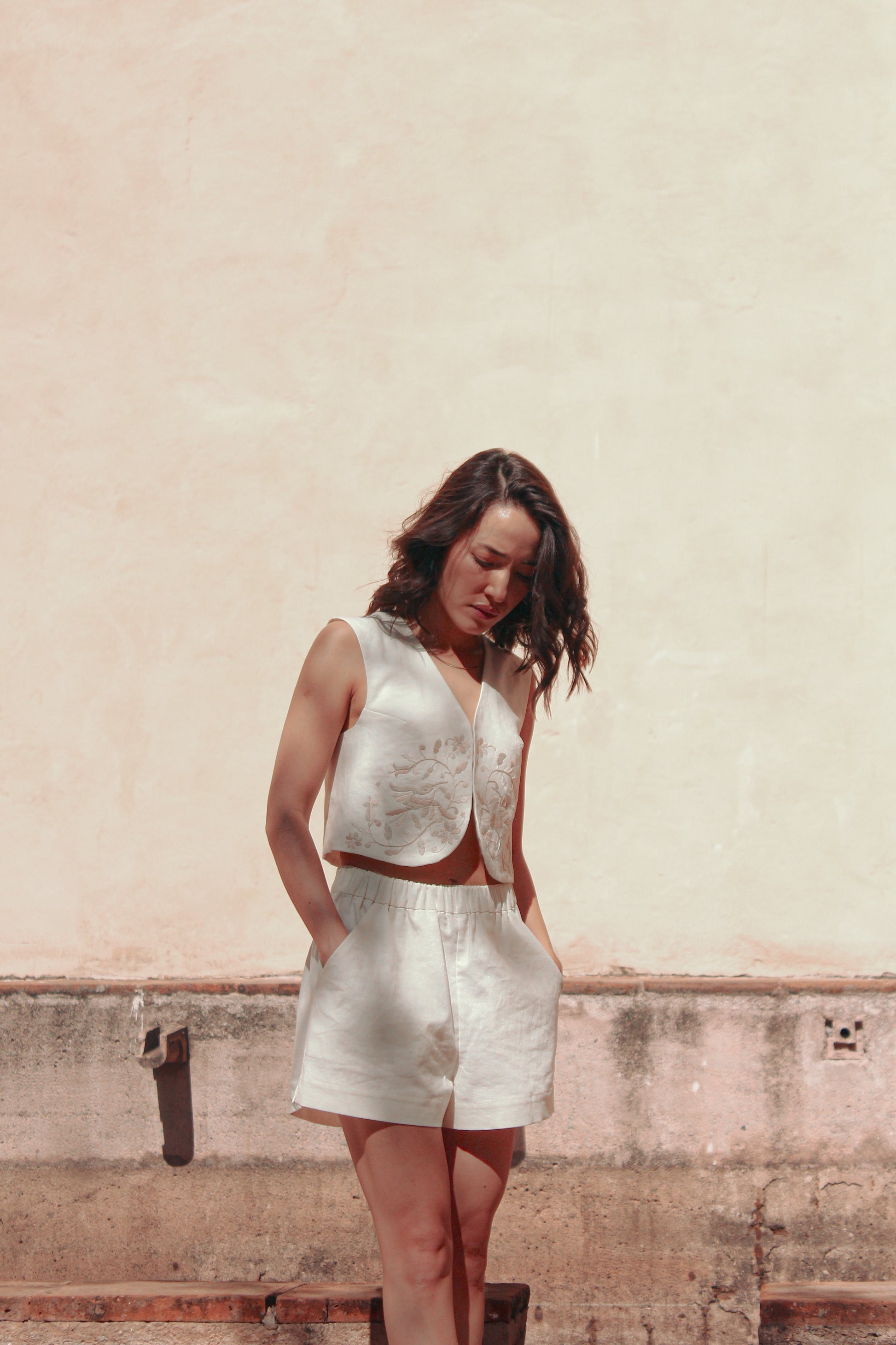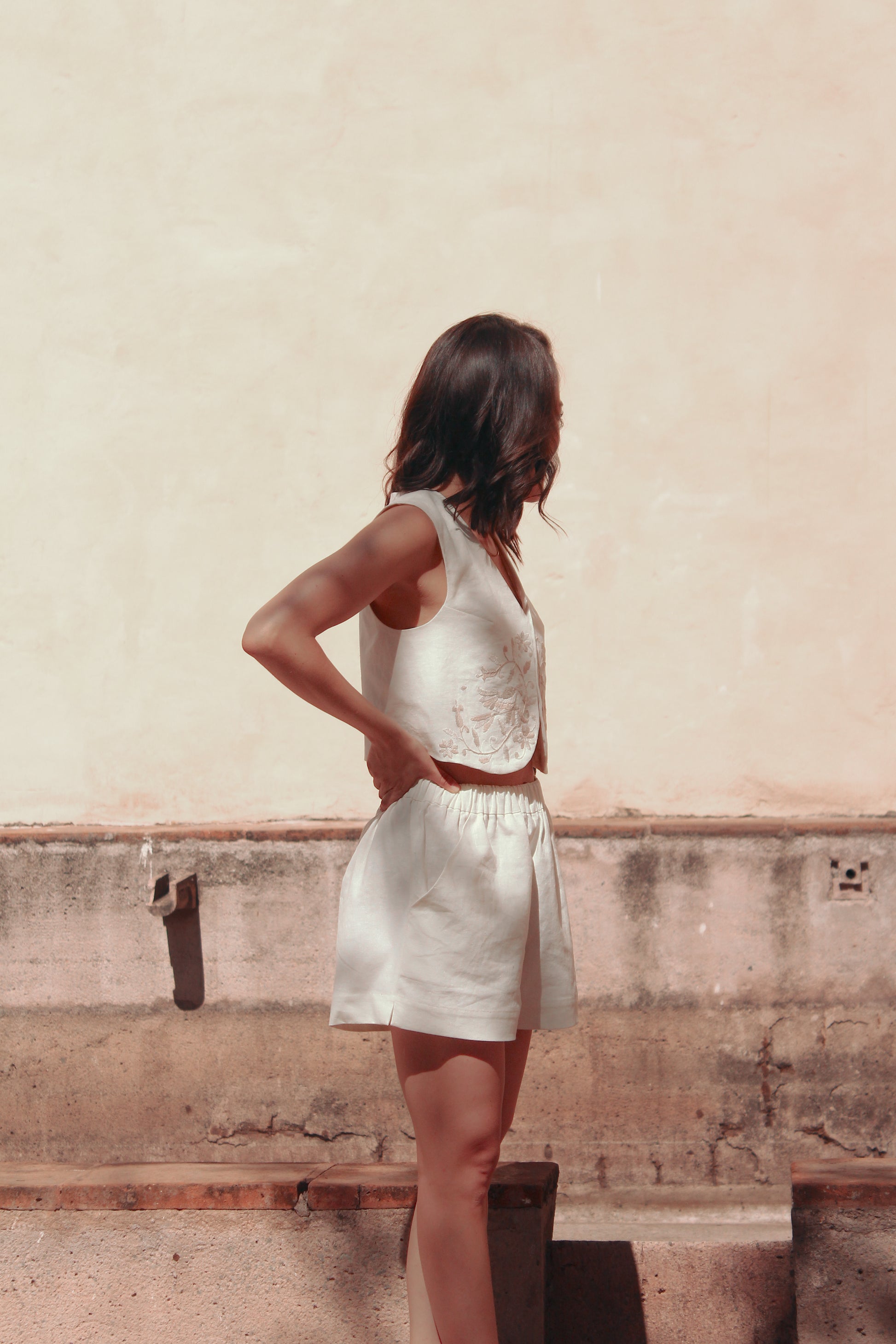 Pantalón corto de silueta holgada, entrepierna baja, con resorte en la cintura, bolsas en los costados, pinzas traseras, una pequeña abertura decorativa en ancho de pierna, cosido con costura francesa para un mejor acabado. Hecho con Lino 55% y Algodón 45% [Certificado OEKO-TEX®: SE015 132342]